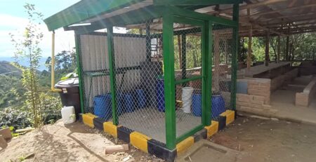 Las familias de la Fundación Pro Vivienda Villa Luisa se reúnen para construir la plataforma donde se instalará la estación de beneficio (despulpadora de 600 k/h) con la tecnología Ecomil, la cual contribuye con el consumo eficiente del agua. Reduciendo hasta el 95% de consumo de agua Vs el lavado tradicional.